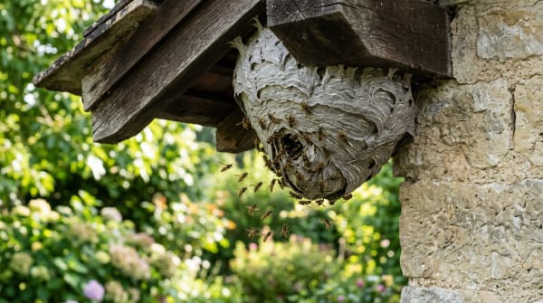 Dans 40 % des cas, les techniciens Nuisibook interviennent sur des nids situés sous les toitures ou dans les combles. Les haies denses et les arbustes représentent environ 25 % des interventions. Les nids souterrains (terriers abandonnés, interstices de murets) comptent pour 20 % des cas et sont les plus dangereux, car invisibles jusqu'au moment où quelqu'un marche dessus. Enfin, les murs creux, les cheminées condamnées et les abris de jardin complètent le tableau. Plus le nid est dissimulé, plus il a le temps de grossir avant d'être repéré — d'où l'importance d'une inspection régulière dès le printemps.