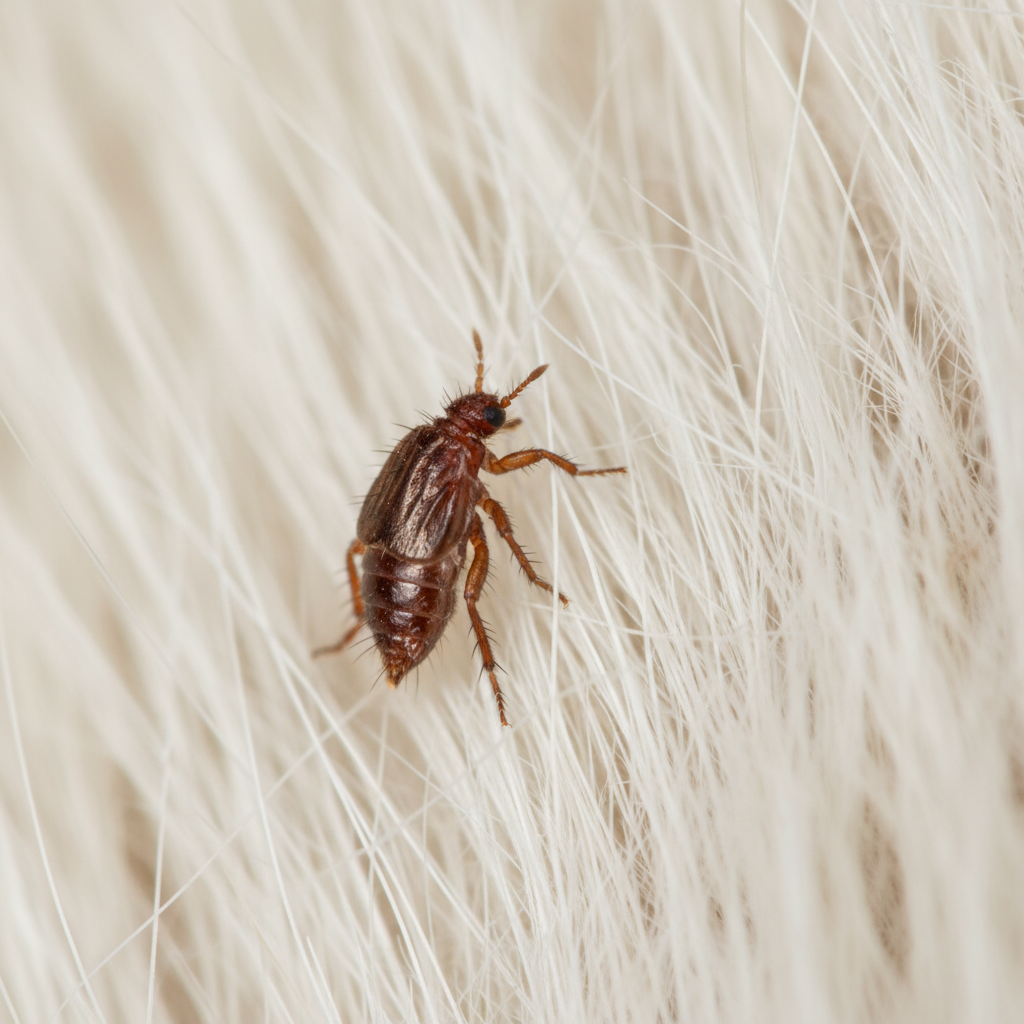 L'exosquelette chitineux brillant, recouvert de soies (poils raides) orientées vers l'arrière, empêche toute extraction manuelle facile : vous ne pouvez pas écraser une puce entre vos doigts car elle glisse, la seule méthode efficace consiste à la coincer entre deux surfaces dures (ongles, lame) ou à la noyer dans de l'eau savonneuse.